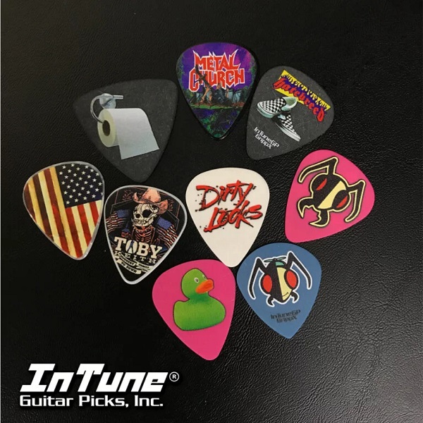 At InTune Guitar Picks, Inc. (InTuneGP), we manufacture guitar picks in a variety of materials, shapes, thicknesses and colors. We specialize in custom guitar picks and personalized guitar picks. Our customizing is a great way to promote your band or business and make great wedding or party favors in single color or full color printing. The uses for custom guitar picks are endless. From business cards to jewelry to playing guitar, custom guitar picks are an affordable way to market your brand. With no artwork or setup fees and 100 guitar picks starting at $35.00, everyone can have custom guitar picks. Custom guitar pick tins are also available and make a great merch item. If you have any questions about our products, just ask. Get Creative and go Custom with InTuneGP. Made in Virginia, USA.
